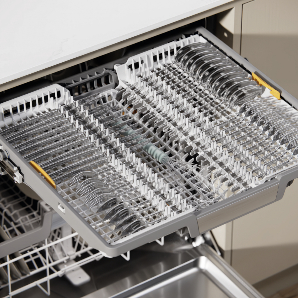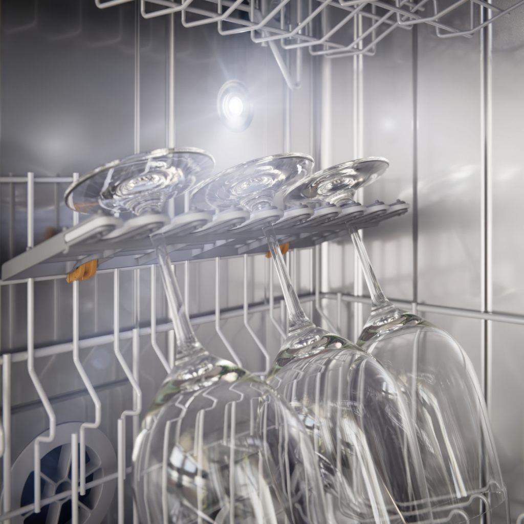 Тримач для келихів FlexCare дбайливо та міцно утримує келихи. Програма делікатного миття очищує лише при 45 °C, а з функцією сушіння AutoOpen келихи висихають, не потребуючи додаткового ручного натирання.