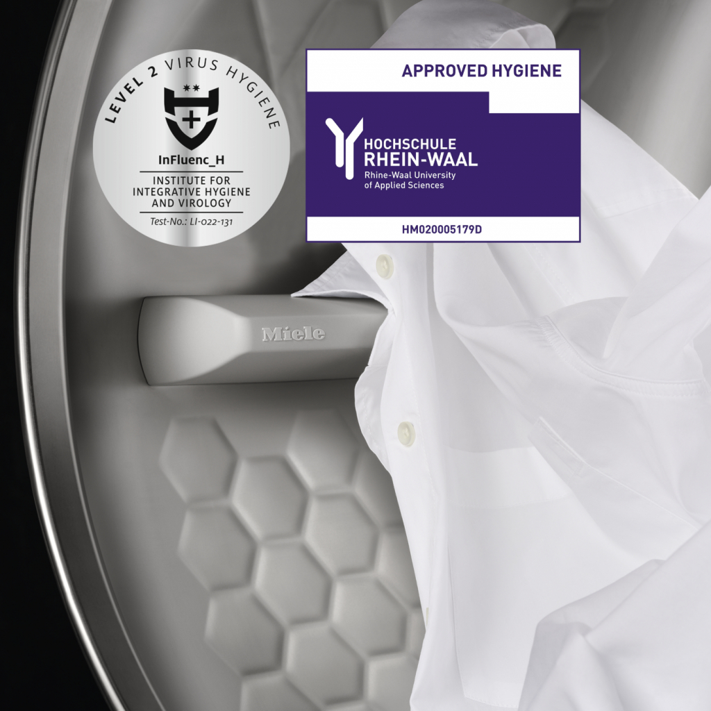 Гігієнічний догляд за білизною - навіть під час сушіння. Завдяки опції сушіння HygieneDry в процесі сушіння з білизни надійно видаляється понад 99,99% бактерій і 99,9% вірусів, завдяки більш тривалому часу підтримки температури. HygieneDry підходить для текстилю з двобальним маркуванням по догляду за текстилем.