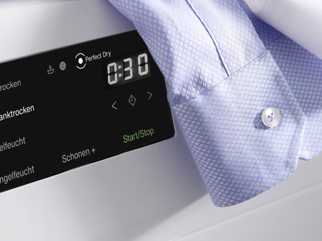 Із цією запатентованою системою білизна висихає ідеально навіть тоді, коли вода містить значну кількість кальцію. Це не типово для машин без системи Perfect Dry, оскільки кальцій, який міститься у воді, впливає на визначення залишкової вологості та, відповідно, на результати сушіння. Система Perfect Dry регулює процес висушування відповідно до вмісту кальцію у воді. Це дозволяє завжди досягати потрібного рівня сушіння.